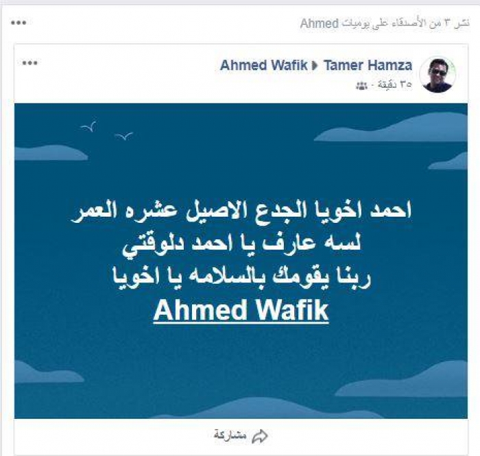 وكتب "حمزة"، لـ"وفيق": " أحمد أخويا الجدع الأصيل عشرة العمر، لسة عارف يا احمد دلوقتي، ربنا يقومك بالسلامة يا أخويا".