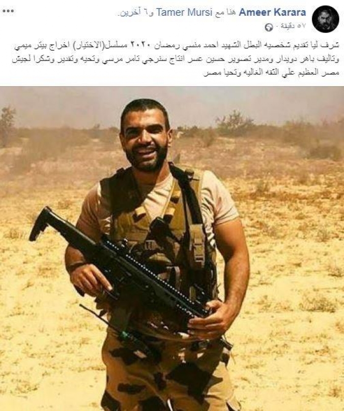 نشر الفنان المصري أمير كرارة، عبر حسابه الشخصي بموقع "فيس بوك"، منشور يُعلق به على تجسيد شخصية الشهيد أحمد المنسي، في مسلسل "الاختيار" المقرر عرضه بموسم رمضان 2020.