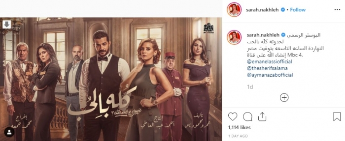 وعلقت نخلة على البوستر:" البوستر الرسمي لحدوتة كله بالحب، النهاردة الساعة التاسعة بتوقيت مصر، على شاشة "MBC".