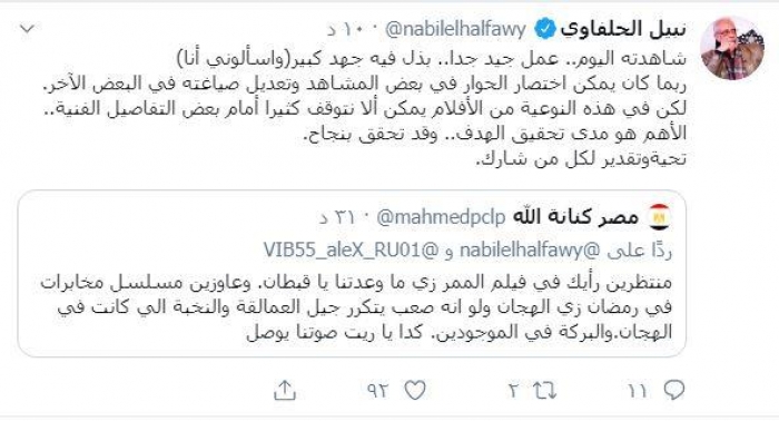 نشر الفنان المصري الكبير نبيل الحلفاوي، عبر حسابه الشخصي بموقع "تويتر" تغريدة يرد بها على أحد متابعيه سأله عن رأيه في فيلم "الممر" للمخرج شريف عرفة.