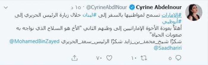 وكتبت سيرين: "الإمارات تسمح لمواطنيها بالسفر إلى لبنان خلال زيارة الرئيس الحريري إلى أبوظبي، أهلاً بعودة الأخوة الإماراتيين إلى وطنهم الثاني "الأخ هو السلاح الذي نواجه به صعوبات الحياة"، شكرًا للشيخ محمد بن زايد شكرًا للرئيس سعد الحريري".