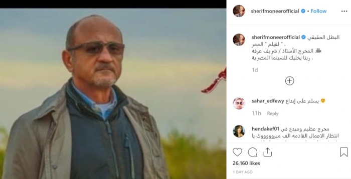 علق منير على الصورة قائلاً: "البطل الحقيقي لفيلم الممر، المخرج الأستاذ شريف عرفة، ربنا يخليك للسينما المصرية".