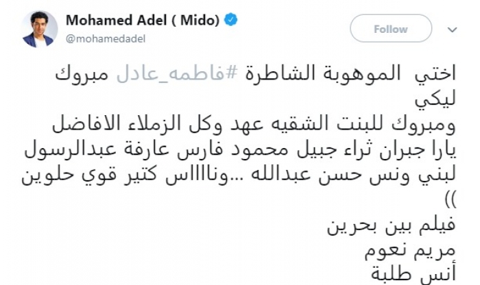 وكتب ميدو، عبر حسابه الرسمي بموقع "تويتر": "أختي الموهوبة الشاطرة فاطمة عادل، مبروك ليكي ومبروك للبنت الشقية عهد وكل الزملاء الأفاضل يارا جبران، ثراء جبيل، محمود فارس، عارفة عبدالرسول، لبني وأنس حسن عبدالله ، وناس كتير قوي حلوين، فيلم بين بحرين".