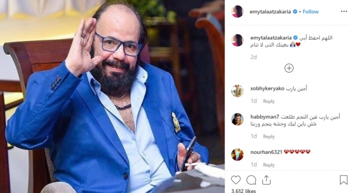 وكشفت ابنته الفنانة الشابة إيمي طلعت زكريا، عن تدهور حالته الصحية ونشرت أول أمس صورة لوالدها عبر حسابها الرسمي بموقع "انستجرام"، وعلقت قائلة :"اللهم احفظ أبي بعينك التي لا تنام"، لتنهال تعليقات الجمهور متمنية الشفاء للفنان القدير.