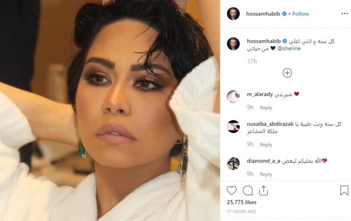 نشر الفنان المصري حسام حبيب، عبر حسابه الشخصي بموقع "إنستجرام"، صورة لزوجته النجمة شيرين عبدالوهاب، يهنئها فيها بعيد ميلادها.