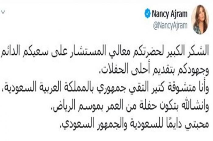 وكتبت نانسي، تغريدة عبر حسابها الرسمي بموقع "تويتر": "الشكر الكبير لحضرتكم معالي المستشار على سعيكم الدائم وجهودكم بتقديم أحلى الحفلات، وأنا متشوقة كتير التقي جمهوري بالمملكة العربية السعودية، وانشاء الله بتكون حفلة من العمر بموسم الرياض،محبتي دايمًا للسعودية والجمهور السعودي".