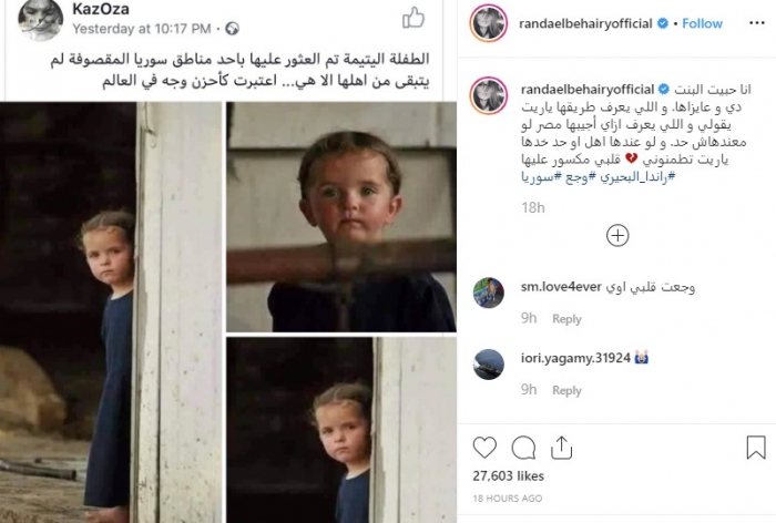 نشرت الفنانة المصرية رندا البحيري، عبر حسابها الشخصي بموقع "إنستجرام" صورة لفتاة سورية، توفيت أسرتها في القصف التركي.