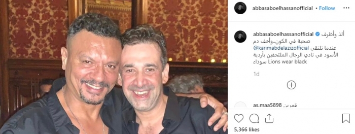 نشر الفنان عباس أبو الحسن، عبر حسابه الشخصي بموقع "إنستجرام" صورة تجمعه بالفنان كريم عبدالعزيز، وظهر الاثنان في الصورة بملابس سوداء.
