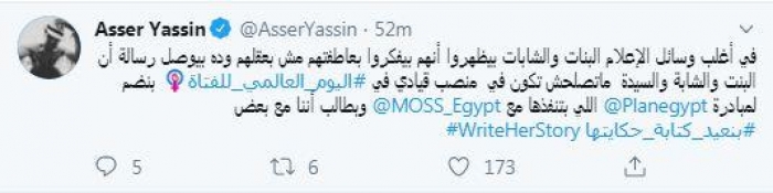 وكتب آسر، عبر حسابه على "تويتر": "في أغلب وسائل الإعلام، البنات والشابات بيظهروا أنهم بيفكروا بعاطفتهم مش بعقلهم، وده بيوصل رسالة أن البنت والشابة والسيدة ما تصلحش تكون في منصب قيادي، في اليوم العالمي للفتاة بنضم لمبادرة بتنفذها وزارة التضامن الاجتماعي، وبطالب إننا مع بعض، نعيد كتابة حكايتها".