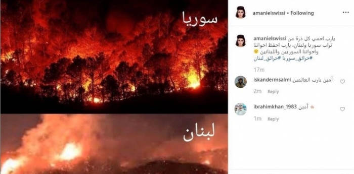 وكتبت:"يارب احمي كل ذرة من تراب سوريا ولبنان، يارب احفظ اخواننا واخواتنا السوريين واللبنانين، حرائق سوريا وحرائق-لبنان".