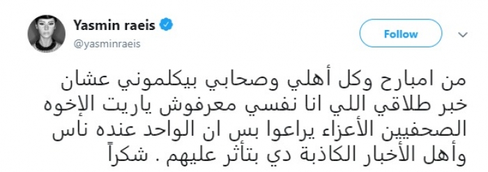 وكتبت رئيس تغريدة، عبر حسابها على "تويتر"، قائلة: "من امبارح وكل أهلي وصحابي بيكلموني عشان خبر طلاقي اللي أنا نفسي معرفوش ياريت الإخوة الصحفيين الأعزاء يراعوا بس إن الواحد عنده ناس وأهل. الأخبار الكاذبة دي بتأثر عليهم. شكرًا".