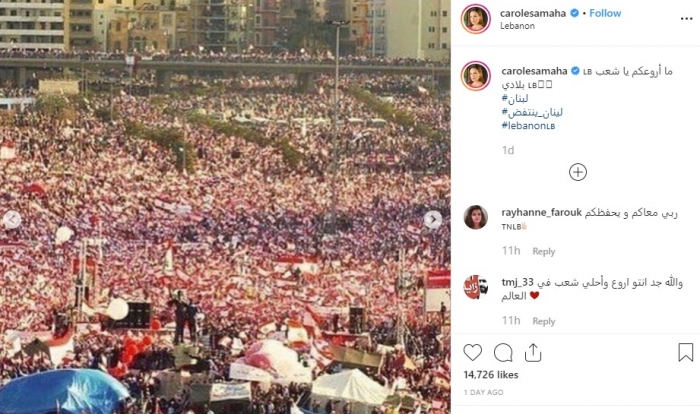 واحتفلت سماحة بالمظهر المشرف لمظاهرات الشعب اللبناني، وعلقت: "ما أروعكم يا شعب بلادي، لبنان ينتفض".