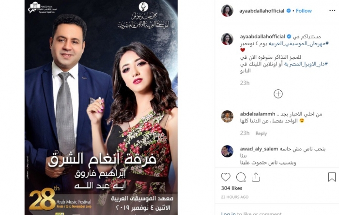 ونشرت آية بوستر دعائي للحفل، عبر حسابها الرسمي بموقع ":إنستجرام"، وعلق:" مستنياكم في مهرجان الموسيقى العربية، يوم 4 نوفمبر".