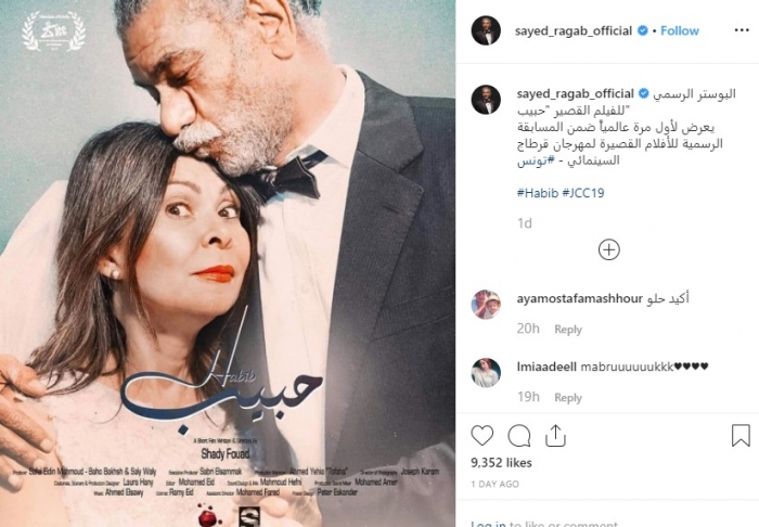 علق رجب على الصورة، قائلاً: "البوستر الرسمي للفيلم القصير (حبيب)، يُعرض لأول مرة عالميًا ضمن المسابقة الرسمية للأفلام القصيرة بمهرجان قرطاج السينمائي"، في الفترة من 26 أكتوبر وحتى 2 نوفمبر المقبل.