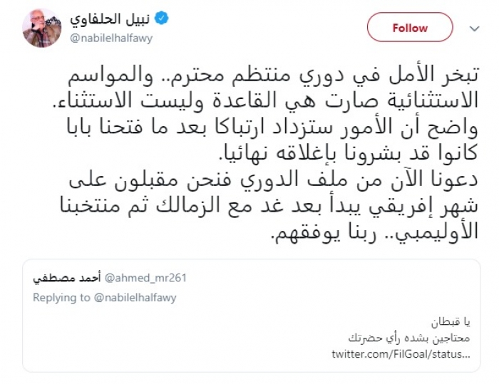 نشر الفنان القدير نبيل الحلفاوي، عبر حسابه الشخصي بموقع "تويتر" تغريدة رد بها على أحد متابعيه سأله عن رأيه في أزمة تأجيل الدوري المصري، وإقامة مباراة القمة في نهاية الدور الأول.