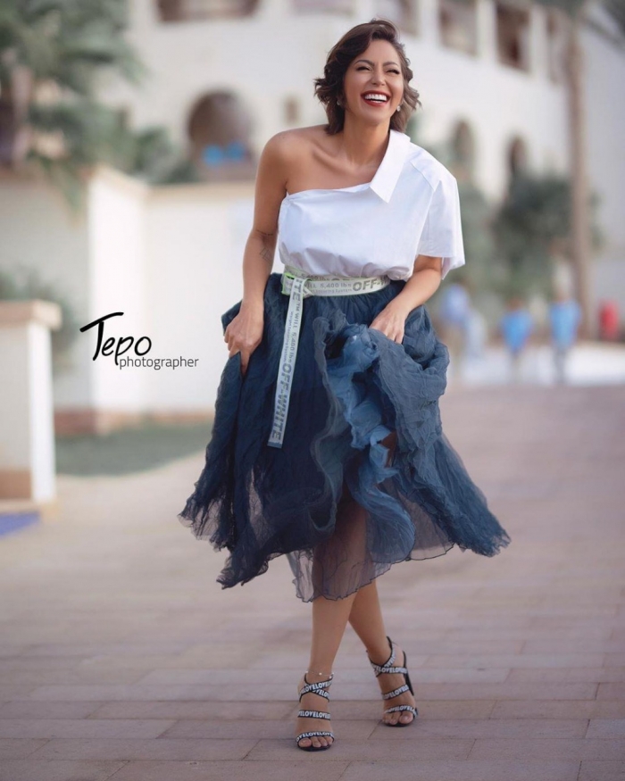 وارتدت لقاء في الجلسة جيب منفوشة باللون الرمادي، ونسقت معها بلوزة بيضاء بكتف مكشوف، وانتعلت فى قدميها حذاءً مكشوفا بكعب عالٍ.