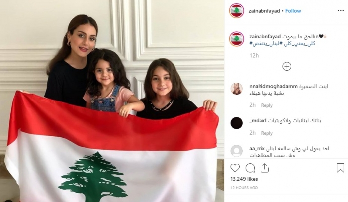 حرصت اللبنانية زينب نصر فياض، نجلة النجمة هيفاء وهبي، على دعم المظاهرات اللبنانية، ونشرت صورة لها ولابنتيها "رهف ودانييلا فايز"، وهن يحملن العلم اللبناني، وذلك على حسابها الرسمي بموقع إنستجرام.