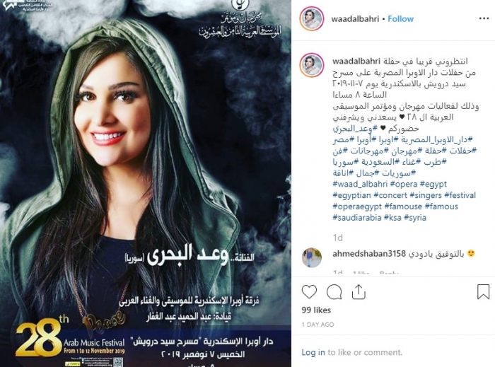 تحيي المطربة السورية وعد البحري، حفلا غنائيا ضمن حفلات دار الأوبرا المصرية بالإسكندرية، ضمن فعاليات الدورة الـ 28 لمهرجان الموسيقى العربية.