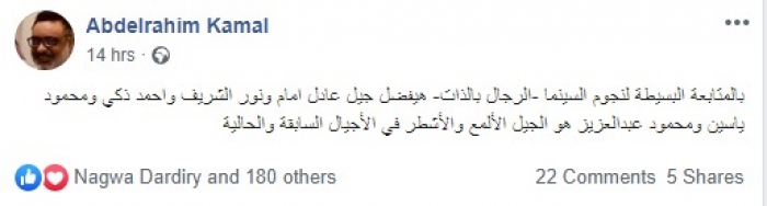 وكتب "كمال في تدوينته: "بالمتابعة البسيطة لنجوم السينما -الرجال بالذات- هيفضل جيل عادل إمام ونور الشريف وأحمد زكي ومحمود ياسين ومحمود عبدالعزيز هو الجيل الألمع والأشطر في الأجيال السابقة والحالية".
