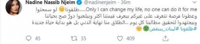 وكتبت عبر حسابها الشخصي على موقع "تويتر": "أنا فقط أستطيع تغيير حياتي، لا أحد يستطيع أن يفعل ذلك عني، مضيفة طلقونا لو سمحتوا وعطونا فرصة نتعرف على غيركم بيعرف قيمتنا اكتر وبيلعبوا دورٌ صح بحياتنا وبيجتهدوا لتحقيق مطالبنا كل يوم".
