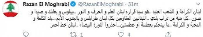 وكتبت رزان، عبر حسابها على "تويتر"، قائلة: "لبنان الكرامة والشعب العنيد.. هو سيد قراره، لبنان العلم والحرف و النور.. بيبلوس وبعلبك وصيدا وصور...كل حبة من تراب بلدي".