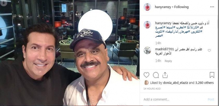 وفي تعليقه على صورة جمعته بالفنان داوود حسين، كتب: "أنا وداوود حسين، والضحكة تجمعنا في كازابلانكا المغرب، مهرجان الدار البيضاء".