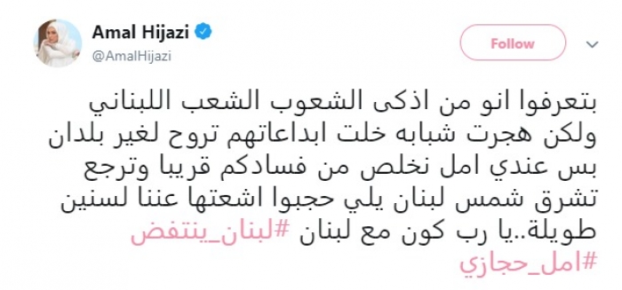 وكتبت أمل تغريدة، عبر حسابها الرسمي بموقع "تويتر":" بتعرفوا انو من أذكى الشعوب الشعب اللبناني، ولكن هجرت شبابه خلت إبداعاتهم تروح لغير بلدان، بس عندي أمل نخلص من فسادكم قريبا وترجع تشرق شمس لبنان يلي حجبوا أشعتها عننا لسنين طويلة، يا رب كون مع لبنان".