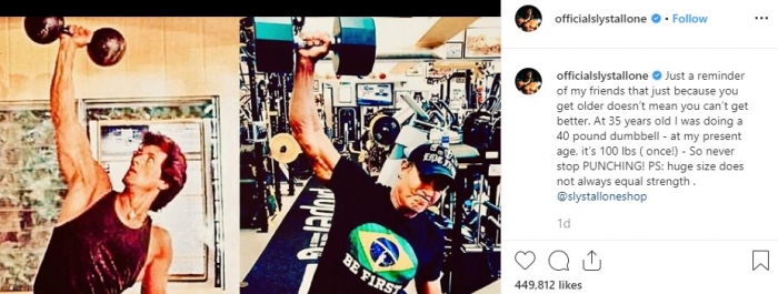 وكتب ستالون: "للذكرى فقط لأصدقائي، فقط تذكروا كونك كبرت لا يعني أنك لن تكون أفضل، في سن الخامسة والثلاثين كنت أقوم برفع 40 رطل من الأثقال، في سني الحالي (73 سنة) استطيع أن أحمل 100 رطل، لذا لا تتوقف عن المحاولة، ملحوظة الوزن الضخم لا يساوي دائما القوة".