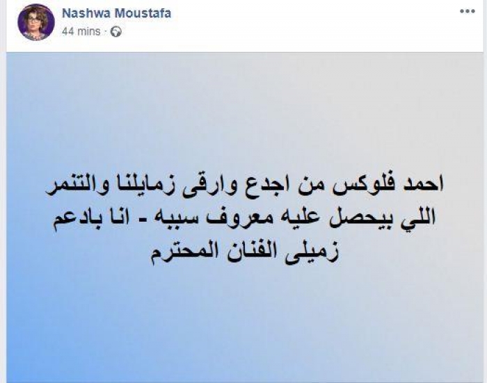 وكتبت "نشوى" عبر حسابها الرسمي بموقع فيسبوك: "أحمد فلوكس من أجدع وأرقى زمايلنا، والتنمر اللي بيحصل عليه معروف سببه، أنا بدعم زميلى الفنان المحترم".