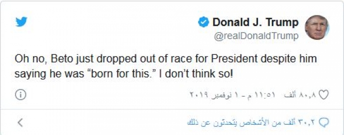 وغرّد ترامب عبر موقع التواصل الاجتماعي "تويتر"، ساخرًا عقب إعلان المرشح الديمقراطي بيتو اورورك، انسحابه من انتخابات حزبه التمهيدية لسباق البيت الأبيض، بعد أشهر من استطلاعات الرأي المخيبة لآماله وفي ظل صعوبات يواجهها لتمويل حملته.