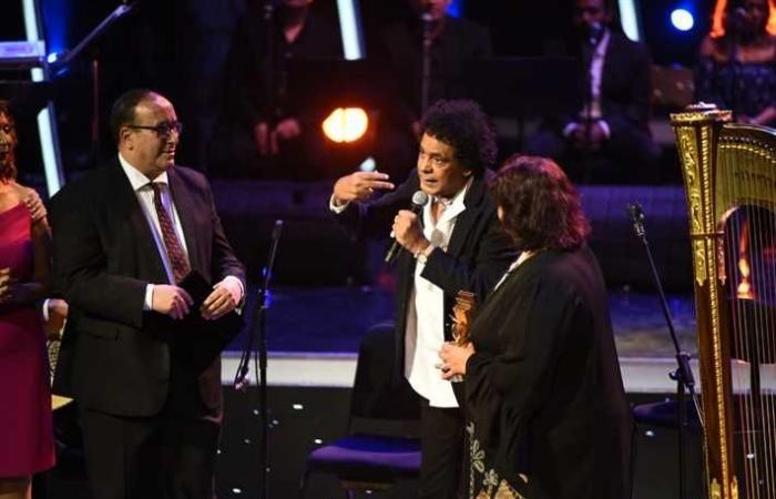 وقامت بعد انتهاء الأغنية وزيرة الثقافة الدكتورة إيناس عبدالدايم، ورئيس الأوبرا الدكتور مجدي صابر، والمخرجة جيهان مرسي بتسليمه درع المهرجان، ليعبر عن سعادته وامتنانه بحصوله على تكريم من مهرجان عريق يحمل اسم بلده.