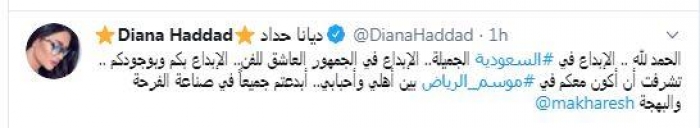 وكتبت ديانا، عبر حسابها على "تويتر"، قائلة: "الحمد لله.. الإبداع في السعودية الجميلة.. الإبداع في الجمهور العاشق للفن.. الإبداع بكم وبوجودكم".