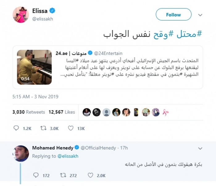 وردت إليسا، على ما فعله "أفيخاي" عبر حسابها على "تويتر"، قائلة: "محتل.. وقح، نفس الجواب"، وهو نفس الرد الذي وجهته له من قبل عندما حاول "أفيخاي" مداعبتها على إحدى تغريداتها بشأن القضية الفلسطينية .