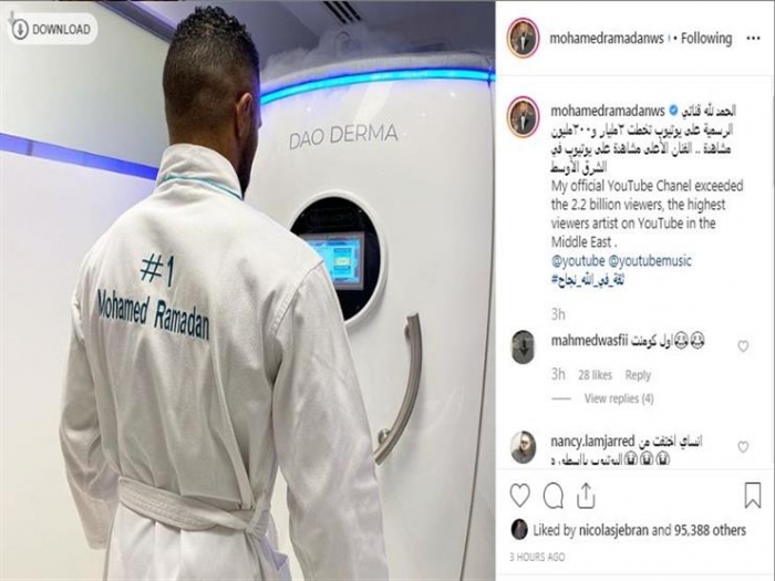 ونشر رمضان، صورة له عبر حسابه على"إنستجرام"، ظهر خلالها مرتديًا "روب" يحمل اسمه ورقم 1، وعلق: "الحمد لله قناتي الرسمية على يوتيوب تخطت ٢مليار و٢٠٠مليون مشاهدة.. الفنان الأعلى مشاهدة على يوتيوب في الشرق الأوسط".