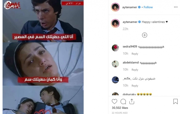 ونشرت أيتن، عبر حسابها الشخصي بموقع إنستجرام "كوميكس" لمشهد اعتراف بطلي فيلم "غرام الأفاعي" هشام عبد الحميد وليلى علوي، بقتل كلاً منهما للآخر بالسم، وعلقت كاتبة: "عيد حب سعيد".