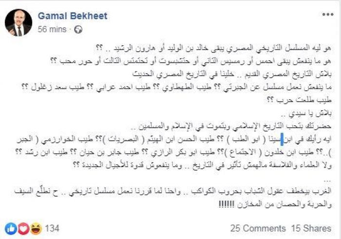 وأضاف بخيت: "بلاش التاريخ المصري القديم، خلينا في التاريخ المصري الحديث، ما ينفعش نعمل مسلسل عن الجبرتي ؟؟ طيب الطهطاوي ؟؟ طيب أحمد عرابي ؟؟ طيب سعد زغلول ؟؟ طيب طلعت حرب ؟؟