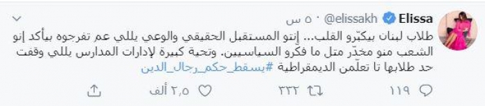وغردت "إليسا"، قائلة: "طلاب لبنان بيكبّروا القلب، إنتو المستقبل الحقيقي والوعي يللي عم تفرجوه بيأكد إنو الشعب منو مخدّر متل ما فكّرو السياسيين، وتحية كبيرة لإدارات المدارس يللي وقفت حد طلابها تا تعلّمن الديمقراطية، يسقط حكم رجال الدين".
