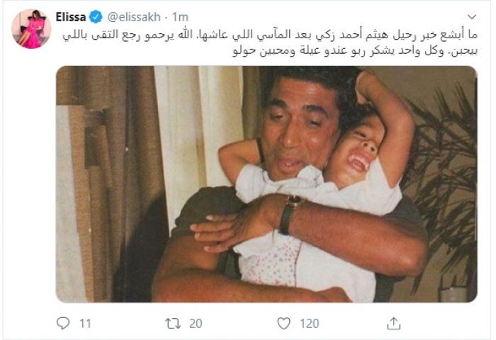 وغردت إليسا، عبر حسابها على تويتر، قائلة: "ما أبشع خبر رحيل هيثم احمد زكي بعد المآسى اللى عاشها، الله يرحمه رجع التقى باللى بيحبهم، وكل واحد يشكر ربه عندوا عيلة ومحبين بجانبه".