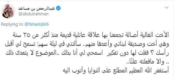 ونشر الأمير عبدالرحمن، عبر موقع التواصل الاجتماعي المصغر "تويتر"، تغريدة مفادها: "الأخت الغالية أصالة تجمعنا بها علاقة عائلية قديمة منذ أكثر من 25 سنة، وهي أخت وصديقة لبناتي وأعدها منهن".