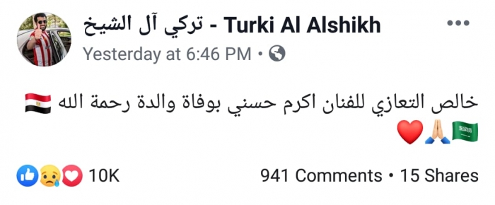 نشر المستشار تركي آل الشيخ، رئيس هيئة الترفيه بالسعودية، عبر حسابه الشخصي بموقع "فيس بوك" تدوينة يعزي بها أكرم حسني، في وفاة والده الكابتن حسني عبد الرحيم.