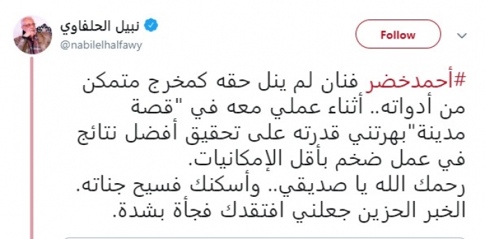 وقال الحلفاوي أن المخرج الراحل لم ينل حقه، وكتب في تغريدته على تويتر: "أحمد خضر فنان لم ينل حقه كمخرج متمكن من أدواته".