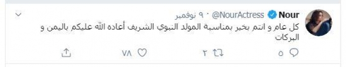 وكتبت نور، عبر حسابها على "تويتر": "كل عام وأنتم بخير بمناسبة المولد النبوي الشريف، أعاده الله عليكم باليمن والبركات".