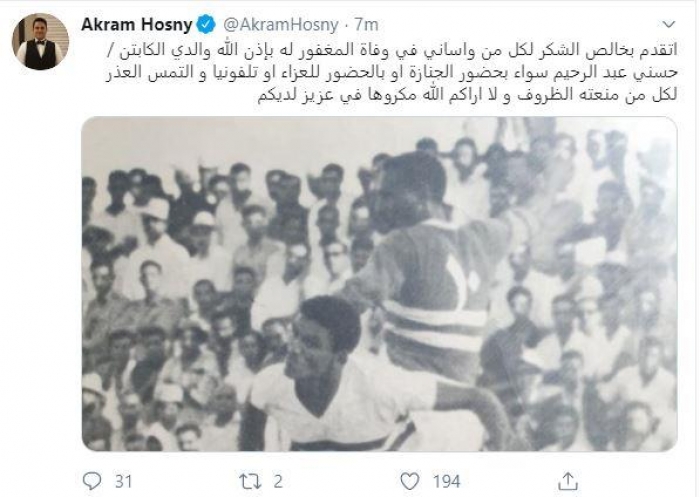 وكتب أكرم عبر حسابه الشخصي على موقع "تويتر": "أتقدم بخالص الشكر لكل من واساني في وفاة المغفور له بإذن الله والدي الكابتن حسني عبدالرحيم سواء بحضور الجنازة أو بالحضور للعزاء أو تليفونيا".