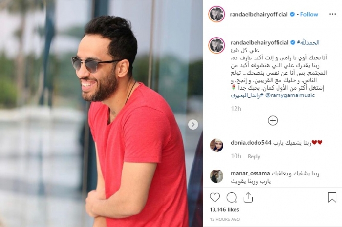 وكتبت: "الحمد لله على كل شيء، أنا بحبك أوي يا رامي، وإنت أكيد عارف ده، ربنا يقدرك على اللي هتشوفه أكيد من المجتمع، بس أنا عن نفسي بنصحك، تولع الناس، و خليك مع القريبين، وانجح واشتغل أكتر من الأول كمان، بحبك جدا".