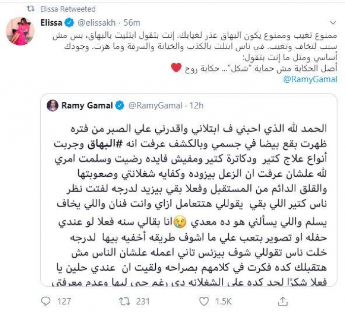 وكتبت إليسا على موقع "تويتر"، تعليقًا على تغريدة رامي: "ممنوع تغيب وممنوع يكون البهاق عذر لغيابك. انت بتقول ابتليت بالبهاق، بس مش سبب لتخاف وتغيب. في ناس ابتليت بالكذب والخيانة والسرقة وما هزت. وجودك أساسي ومتل ما إنت بتقول: أصل الحكاية مش حكاية شكل.. حكاية روح".