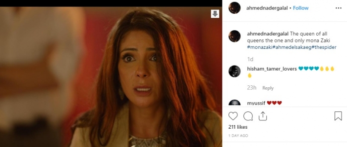 وعلق أحمد نادر جلال على الصورة : "ملكة الملكات، الوحيدة منى زكي، فيلم العنكبوت".