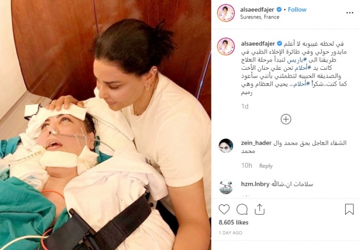 ونشرت فجر صورة تجمعها بأحلام، أثناء تواجدهما بسيارة الإسعاف في فرنسا، وعلقت السعيد على الصورة: " في لحظه غيبوبة لا أعلم ما يدور حولي وفي طائرة الإخلاء الطبي في طريقنا الى باريس لنبدأ مرحلة العلاج كانت يد أحلام تحن علي حنان الأخت والصديقة الحبيبة لتطمئني بأنني سأعود كما كنت، شكراً حلام، يحيي العظام وهي رميم".