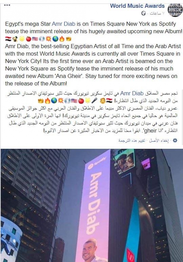 احتفت الصفحة الرسمية لجائزة "وورلد ميوزيك أورد العالمية" بوضع منصة "سبوتيفاي" صور بوسترات ألبوم "أنا غير" للفنان عمرو دياب في ميدان التايمز بنيويورك، ووصفته بنجم مصر العملاق والأكثر مبيعا على الإطلاق.