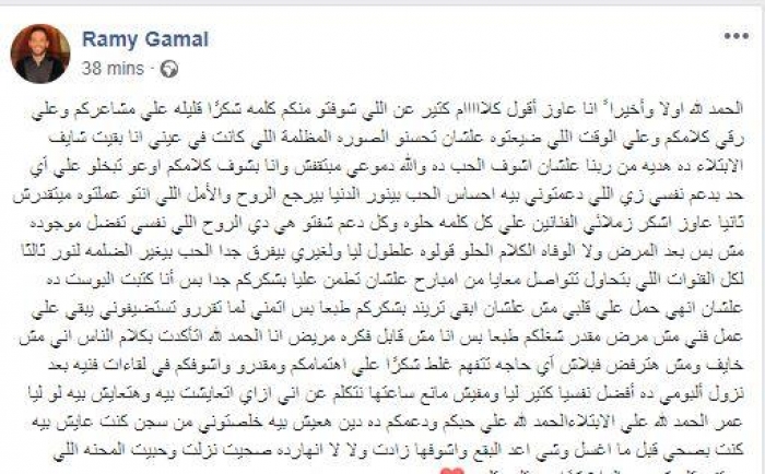 وكتب رامي جمال: " الحمد لله اولا وأخيرا أنا عايز أقول كلام كتير عن اللي شوفتو منكم كلمه شكرًا قليله علي مشاعركم وعلي رقي كلامكم وعلي الوقت اللي ضيعتوه علشان تحسنو الصورة المظلمة اللي كانت في عيني انا بقيت شايف الابتلاء ده هديه من ربنا علشان اشوف الحب ده والله دموعي مبتقفش وانا بشوف كلامكم اوعو تبخلو علي اَي حد بدعم نفسي زي اللي دعمتوني بيه احساس الحب بينور الدنيا بيرجع الروح والأمل اللي انتو عملتوه ميتقدرش".