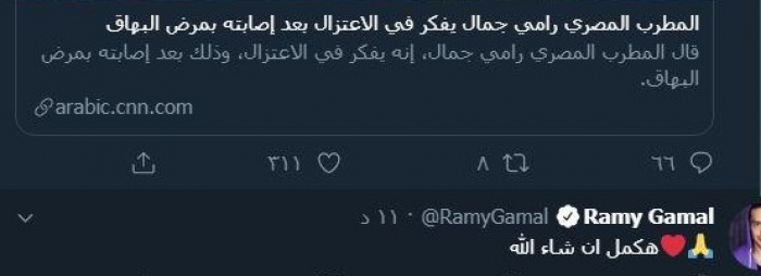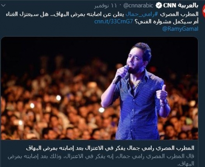نشر الفنان والملحن المصري رامي جمال عبر حسابه الشخصي بموقع "تويتر" ردا على خبر نشره موقع "سي إن إن" الأمريكي عن تفكيره في الاعتزال وترك الغناء، بعد إعلان إصابته بـ"البهاق".